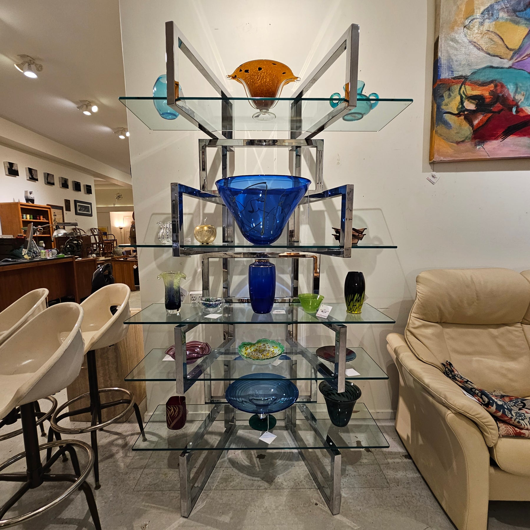 The Milo Baughman Chrome Butterfly Etagere features a sleek chrome frame with butterfly supports that hold five glass shelves. Its versatile design allows you to customize the shelf arrangement to suit your space. This piece shows only minor light cosmetic wear, making it a stylish and functional addition to any room.