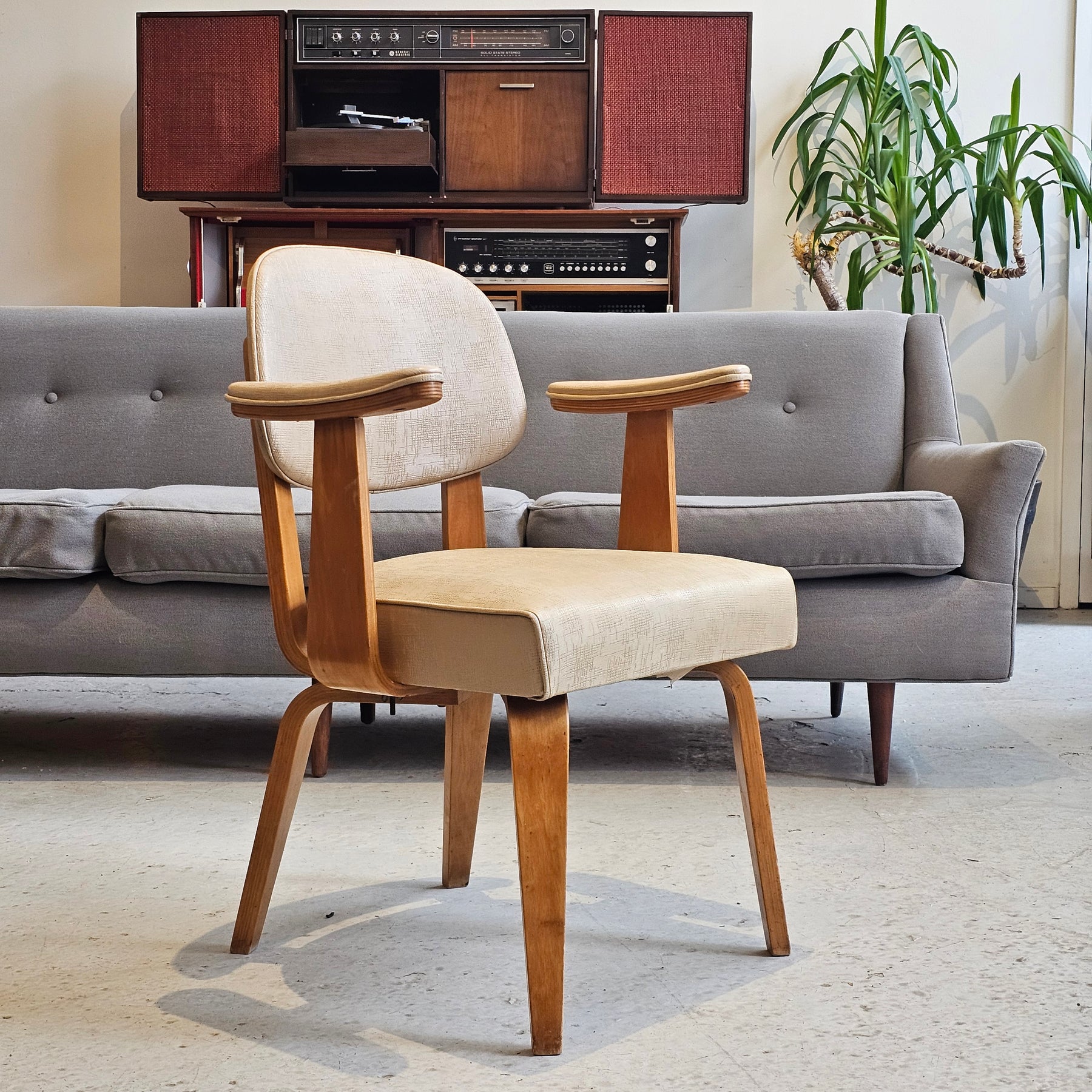 Rare, Thonet, bentwood armchair.   Original vinyl in overall good condition, frame is sturdy.  Some visible repairs to underside of armrests present.  Original Thonet tag still intact.